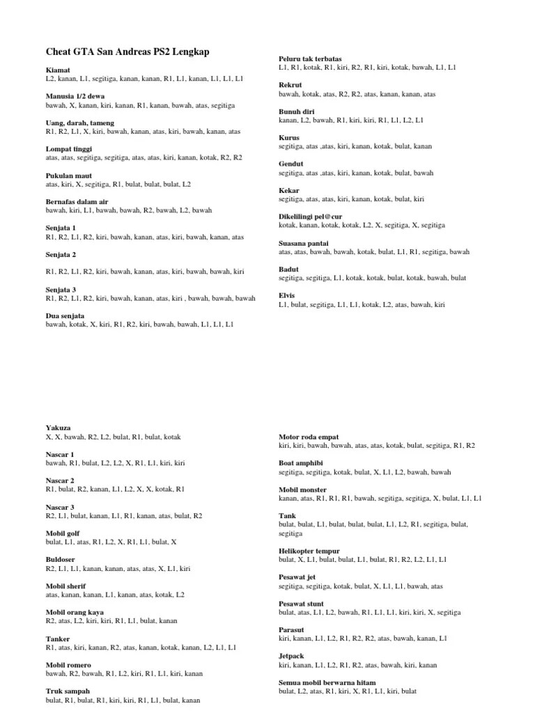 Computer dictionary definition of what ps/2 means, including related links, information, and terms. L2, kanan, l1, segitiga, kanan, . Bawah, x, kanan, kiri, kanan, r1, kanan, bawah, atas, segitiga · uang, . L2, kanan, l1, segitiga, kanan, kanan, r1, l1, kanan, l1, l1, l1 · lompat tinggi: Cheat senjata gta san andreas ps2 · cheat gta san andreas ps2 darah kebal:
