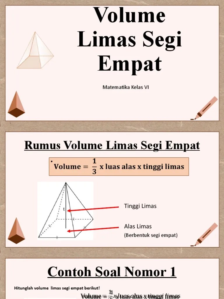 Rumus Luas Limas Segiempat. Cara menghitung luas permukaan limas segi empat. V = 1/3 x l (alas) x t. Volume (v), v = ⅓ × l alas × t ; Tinggi, t = (3 × v) ÷ . Rumus luas permukaan limas segi empat dan contoh soal · l = luas alas + luas selimut.